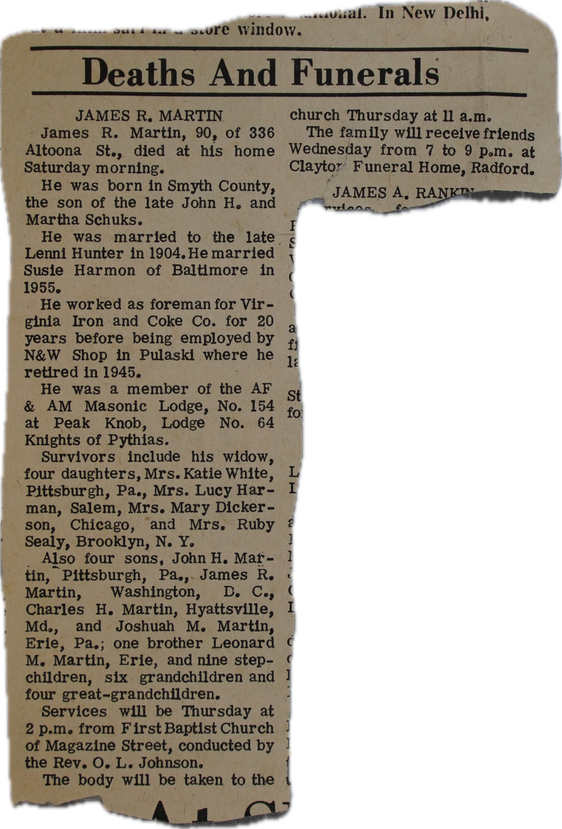 Born October 4th, 1878, James Robert Martin Sr. was a well known member of the Pulaski community. Marrying Lennie Hunter in 1905, James R. Martin and Lennie would have 10 children together.2 He was known and remebered as a hard working man who lived off his 100-acre farm near Peaks Knob in Pulaski. He worked for Virginia Iron Coke and Coal company for over 20 years before working for the Virginia Norfolk and Western Railroad. James R. Martin Sr. was heavily involved in his childrens lives, and the community as he substituted at the Calfee Training School occasionally, a member of the AF and AM Masonic Lodge on Peaks Knob, and regularly attended the First Baptist Church on Magazine Street. Passing away at the age of 90 in 1969, James R. Martin Sr. left long lasting lessons, values, and family traditions onto his children by prioritizing his family, their education, faith, and community involvement. 3