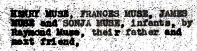 Father Raymond Muse signed on four of his children Henry Muse, the Eldest son, Sonja Muse, the Eldest daughter, Frances Muse, the Youngest daughter, James Muse, the Youngest son, onto the Corbin et al. v. County School Board of Pulaski County, VA. et al. court case filed in 1947.