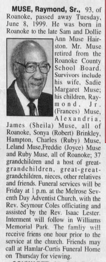 - “Raymond Muse Obituary”, The Roanoke Times, June 10, 1999. Accessed on Ancestry.com ↩︎