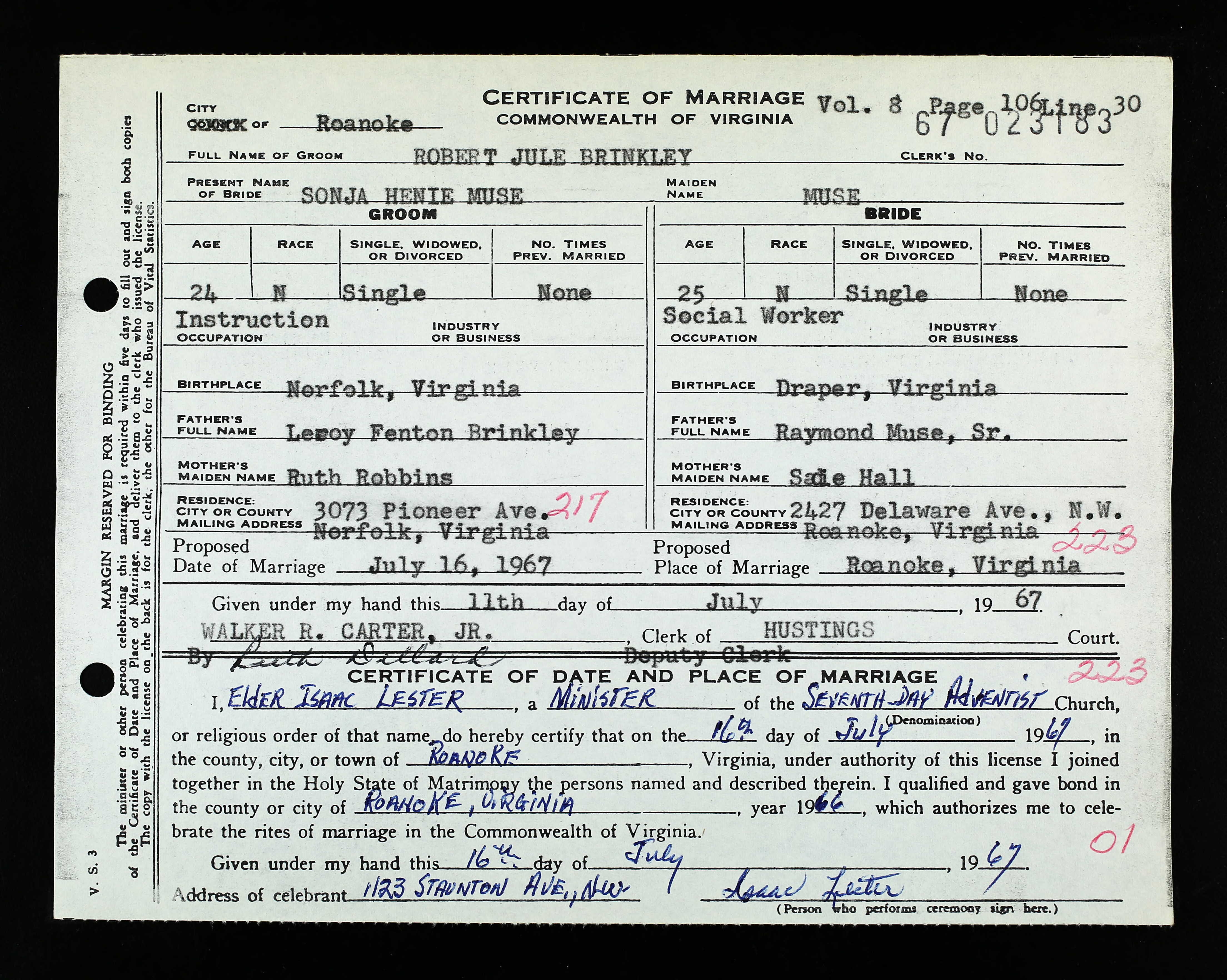 Raymond Muse signed his children — Henry, Frances, James, and Sonja — as infants onto the Corbin et al. v. County School Board of Pulaski County (1947) lawsuit, joining other Black families in the fight for equal education. Born in Roanoke in 1906, Raymond worked as a laborer in a car garage at a time when African-American employment in auto trades was rare. Henry went on to serve as Senior Deacon of the Rose of Sharon Lodge No. 4 and became a mason; Sonja rose as a pianist in the National Fraternity of Students affiliated with the American Federation of Musicians; Frances trained as a nurse and was active in community service at her church in Roanoke; and James won a local boxing competition. The Muse family’s legacy is one of talent, dedication, and unwavering family bonds that carried them forward even as they reached new roles beyond their home community.