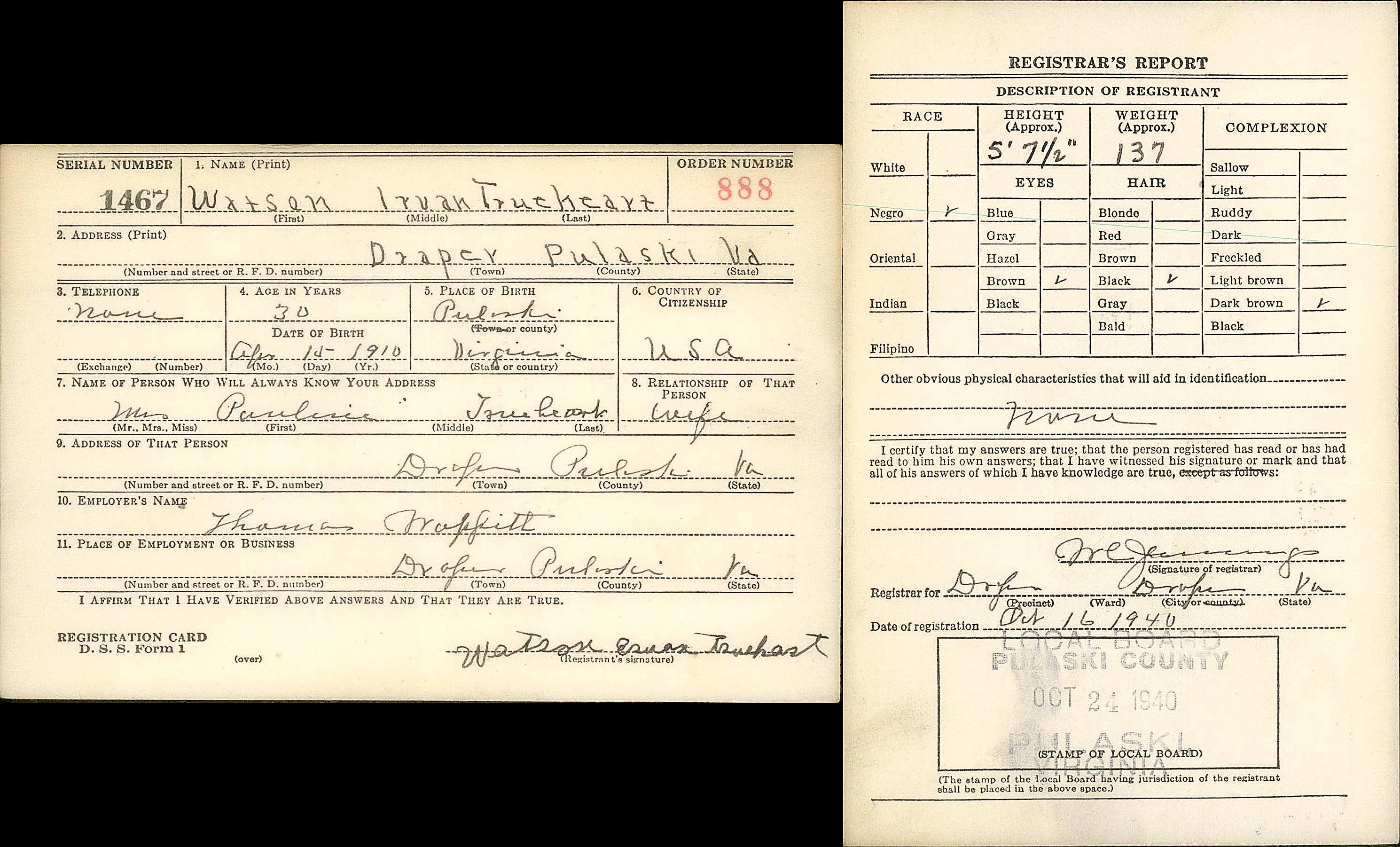 Irvin Watson Trueheart was born on April 15, 1910 to parents Emma Miller and David Trueheart in Pulaski, Virginia. In 1935, Irvin married Pauline Hall and the couple had six children, Billy, Garland, Joseph, George, Thomas, and Eva Dora Truheart.